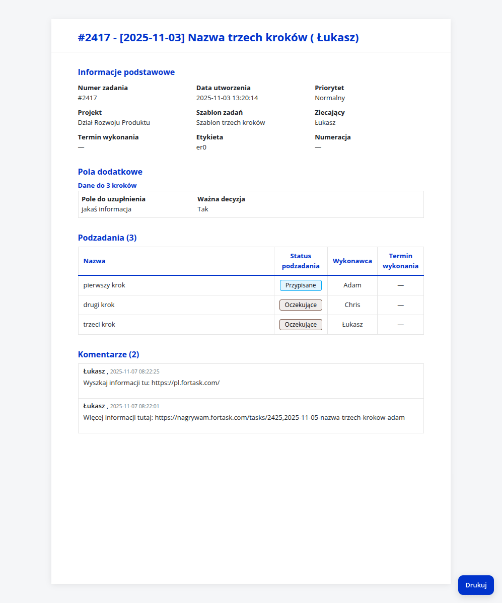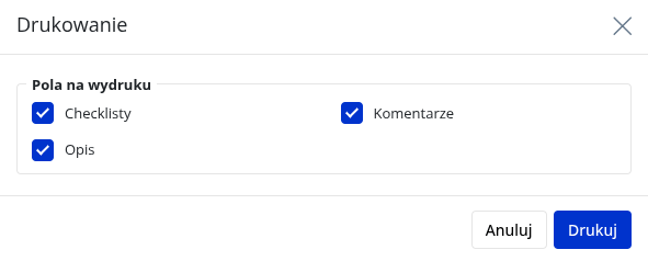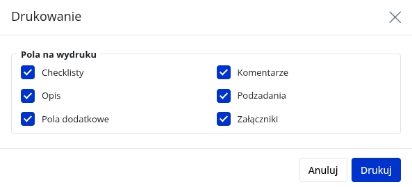 Dodaliśmy możliwość drukowania następujących elementów: zadań, podzadań, postów w kanale oraz wpisach w bazie wiedzy. Opcja drukuj dostępna jest w menu kontekstowym danego elementu. W przypadku druku zadania można dodatkowo wybrać następujące elementy: