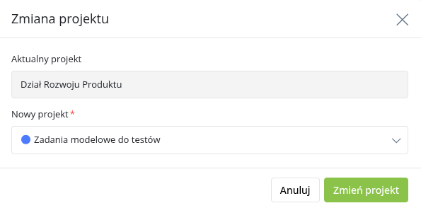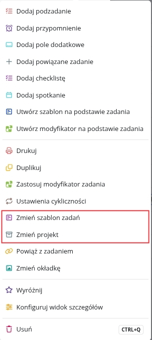 Od teraz dostępne są dwie oddzielne funkcje w menu: "Zmień szablon zadań" oraz "Zmień projekt".